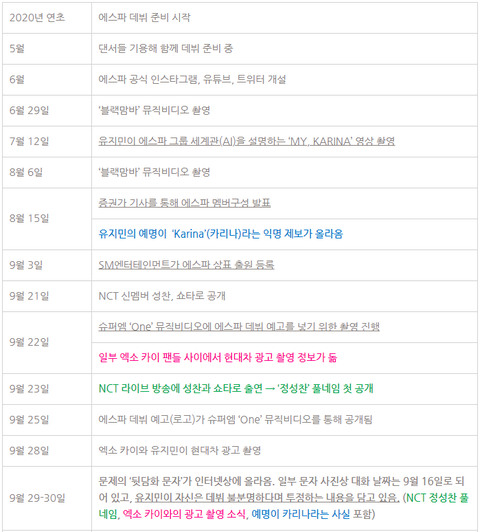 연초부터 데뷔 준비를 해서 5월에 댄서들까지 계약해 데뷔곡을 준비하고, 6월에 공식 SNS를 전부 개설하고 뮤직비디오 촬영을 하고, 7월에 세계관 영상을 찍고, 8월에 증권가 기사로 데뷔그룹 멤버구성을 스포하고, 9월 3일에 그룹 상표 등록까지 끝내고 9월 22일에도 타그룹 뮤직비디오에 에스파 데뷔 예고를 넣는 촬영을 했는데, 유지민은 왜 9월 16일에 "나는 아무것도 안 시켜준다"는 소리를 하고, "빅히트 오디션 한번이라도 볼걸" "YG라도 볼걸"이라며 데뷔와는 연이 끊긴 사람처럼 말을 하고 있을까요? 심지어 한창 데뷔 막바지 준비를 하고, 엑소 카이와의 광고 촬영에 필요한 춤을 연습하고 있을 시기에요. 에스파 4명 중 혼자 그룹을 대표해 세계관 영상 'MY, KARINA'를 촬영한 점도 문자 내용과 상충합니다.