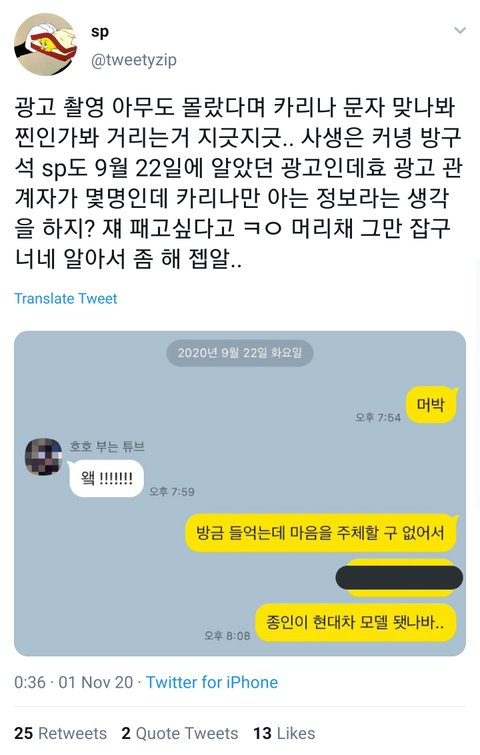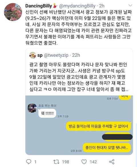 일부 엑소 카이 팬들이 22일에 이미 현대차 광고 촬영 정보를 알고 있었다는 증거입니다. '방구석 팬'조차 광고 촬영 소식, 촬영 컨셉, 촬영기간, 촬영지를 알고 있었습니다. 해당 카카오톡을 공유한 분은 엑소 카이의 팬으로 여전히 같은 트위터 계정을 이용하고 있습니다. 카이의 유명한 팬 역시 해당 트윗을 인용하며, 문자 내용을 진짜라고 믿고 불쾌한 이야기 퍼뜨리는 것을 멈춰달라 부탁합니다.