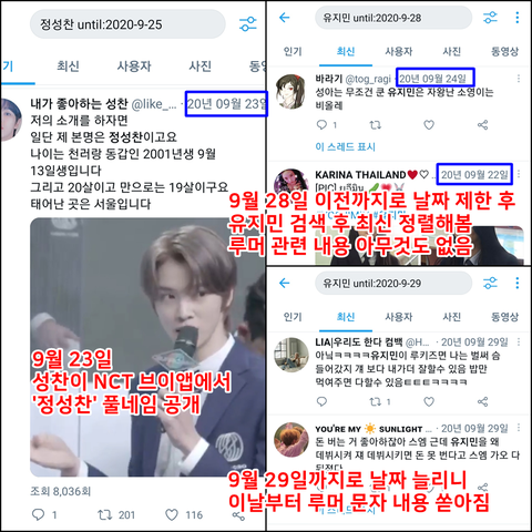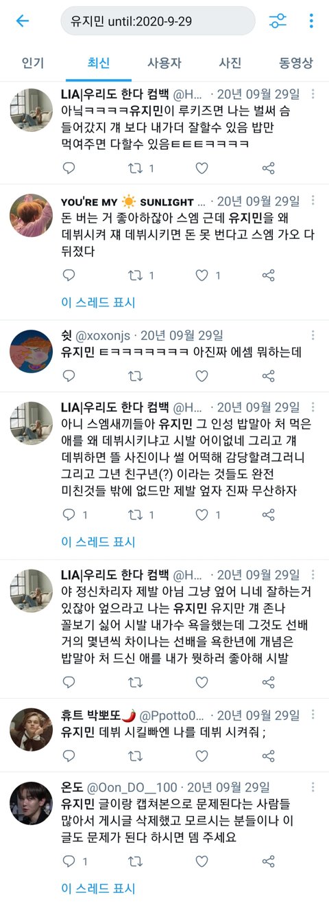 ② - 날짜를 하루 더 늘려 9월 29일까지로 제한 후 최신순으로 정렬하자 드디어 루머 이야기들이 나옵니다. 분명 전날까지는 외국인들의 트윗밖에 없었는데, 29일이 되자 유지민을 향한 한국어 비난과 욕이 쏟아지기 시작합니다.