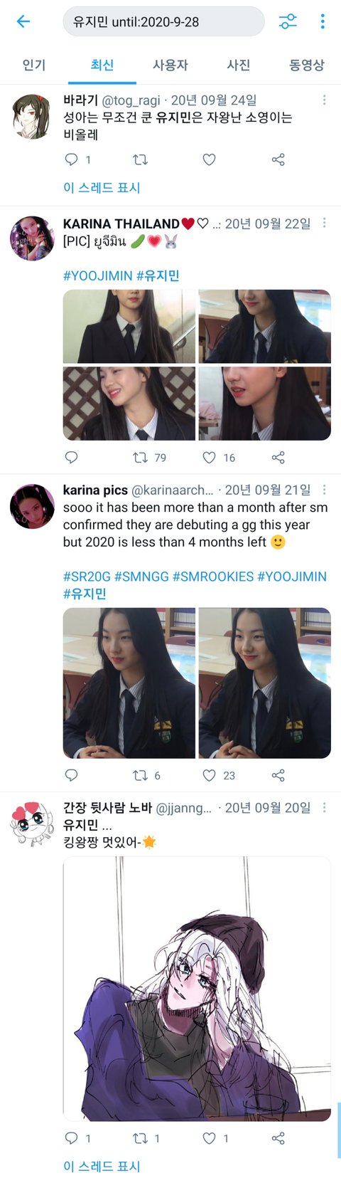 ① - 트위터상에서 '유지민' 검색결과를 9월 28일까지로 제한하고 최신순으로 정렬했습니다. 가장 최신 트윗은 24일에 올라온 트윗으로 유지민과 관련없는 호러게임 캐릭터 이야기입니다. 그리고 그 다음은 그 당시 유지민의 데뷔를 기다리고 있던 일부 외국인들의 트윗만이 이틀, 하루 차이로 띄엄띄엄 발견됩니다. 스크롤을 더 내려도 루머 문자 관련 내용은 하나도 없습니다.