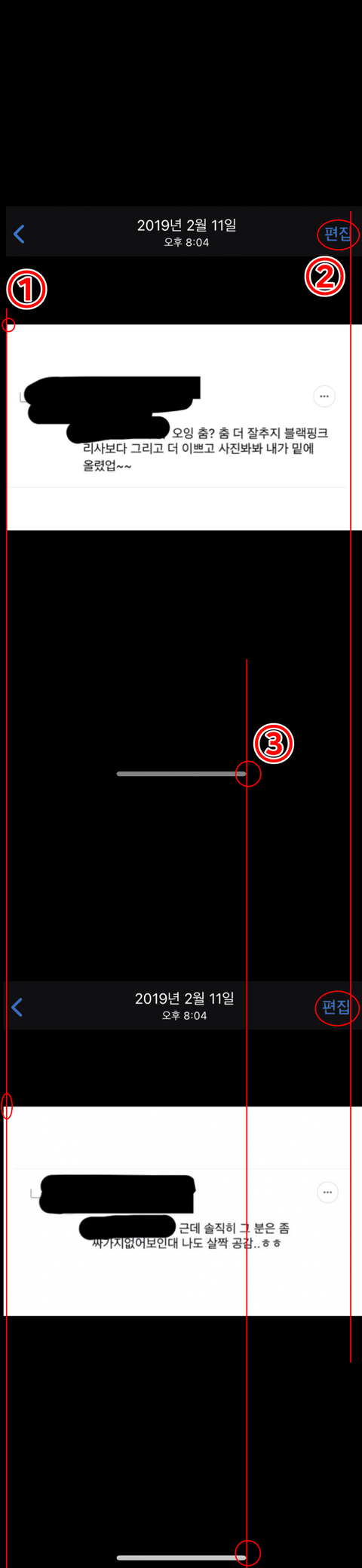 ② - 오른쪽 상단바 편'집'의 'ㅣ'에 맞춰서 또 직선을 그어보니 이쪽도 역시나 차이가 납니다. 다른 날짜 캡쳐를 떼와서 붙인 합성사진이 아니라면 반드시 일치해야 할 직선인데 말이죠.