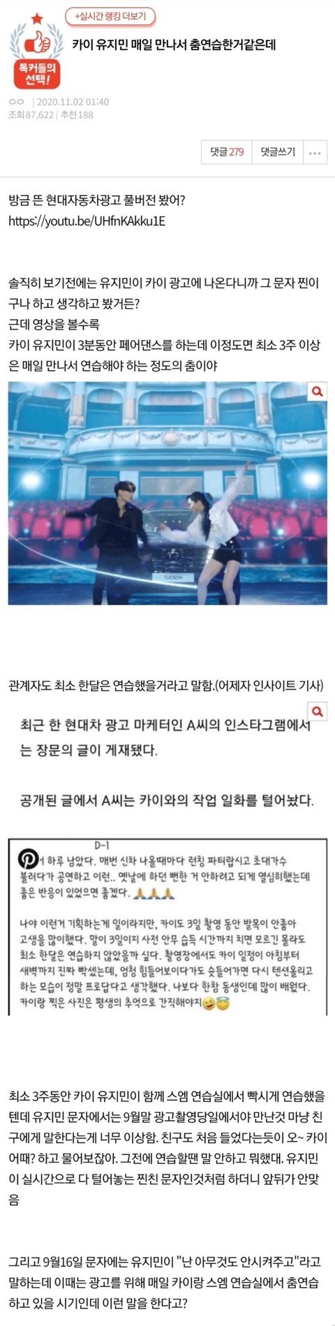 조작문자에서 유지민은 '자신의 모든 비밀을 다 털어놓을 정도로 절친한 구 카이최애 친구'에게 광고 촬영 당일 남양주에서 카이를 처음 본 것처럼 뒷담을 해댑니다. 춤으로 잘 알려진 엑소 메인댄서가 한달이나 연습해야 했던 페어댄스인데, 영상에서 몇 분동안 합을 맞추는 일개 연습생 유지민이 설마 저때 카이를 처음 만났을까요? 단 한번도 함께 합을 맞춰보지 않았을까요? 지면 광고도 아니고 무려 현대차 영상광고를, 전문 댄서들까지 포함해 수많은 스탭 인력이 투입된 거대 프로젝트를 그렇게 작업했을까요?