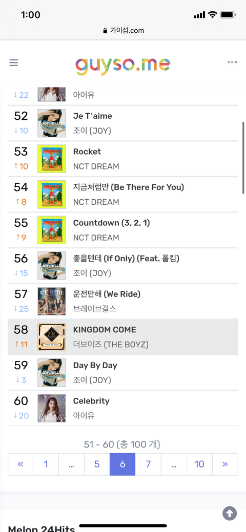 멜롷 58위(⬆️11)/ 지닣 9위(⬆️1) / 벅슿 6위(⬆️6)