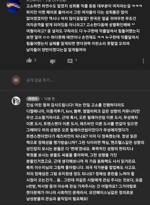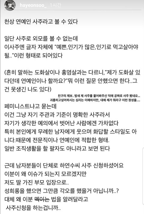 하연수는 본인 기준 무례하고 대가리 빈 발언을 못 참는 건데 그걸로 페미라고 하더라 남자들 스스로 페미 생성해내는 중ㅋㅋㅋㅋㅋ 근데 하연수는 페미 될 만도 함 sns에 답글 말투 딱딱하게 달았다고 남초에서 욕 ㅈㄴ 처먹었잖음
