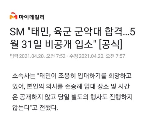 개소리하지마 ☆비공개였음☆ 본인도 조용히 입대하고 싶다는 의사 일찍이 밝혔고 비공개였는데 말이 비공개지 같은 날 논산훈련소로 입소하는 군인만 이천명이고 육군이면 논산훈련소 입소인거 모를수가 없음 기자들 몰려가서 매니저랑 경호팀 밀치고 태클걸고 일반인들 구경한답시고 앗싸 난 봤다ㅇㅈㄹ하는 사람들 개많았는데 그게 왜 태민 탓임