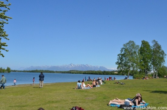 이미 많은 이들이 호수 주변에 모여들어 선텐을 즐기고 있습니다.