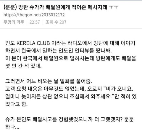 비오는 날 배달해주시는 분께 요청사항 적을 수 있었는데 “비가 오네요, 시간이 얼마나 늦어지든 상관없으니 조심히 와주세요”라고 적었다네? 완전 마음이 따뜻해짐
