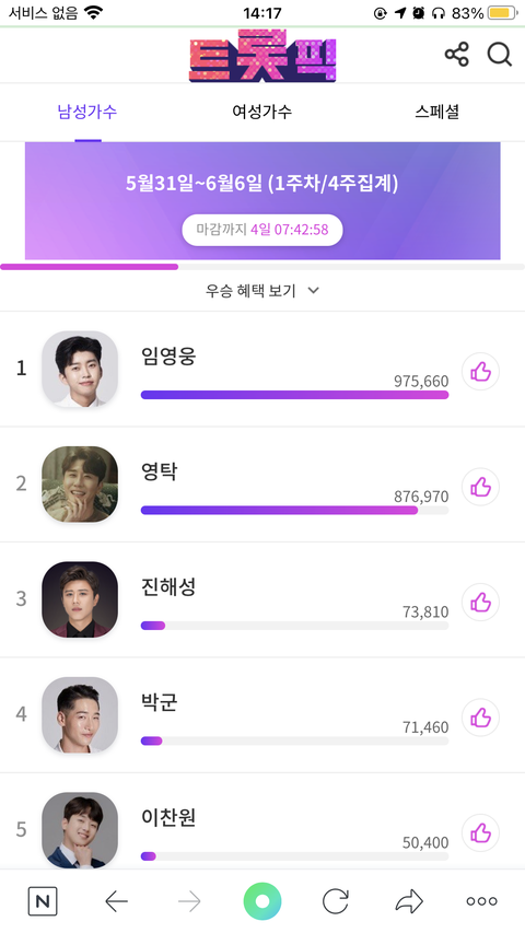 지금 ㅇㅌ님쪽에서 트로트 투표 앱에서 투표진행중인데 4일정도 남았고 ㅇㅇㅇ님이랑 얼마 차이 안나서 저쪽에서도 계속 하고 계신 것 같은데 앱 깔고 가입하고 투표권받고,, 거의 후추급이긴한데 투표 마감이 4일뒤니까 우리 화력이 그렇개 좋지 않더라도 막 뒤통수 당할 일은 없고 진짜 조금이나마 우리 문투에 도움을 주시지 않을까..?
