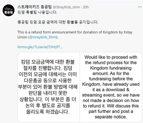 스트레이키즈 총공팀 킹덤 모금 환불폼 Kstay Union (@straykids_Strm) Kingdom Fundraising Refund Foam (google.com)
