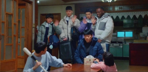 가운데 있는 탕준상(윤해강 역)만 야구복을 입고