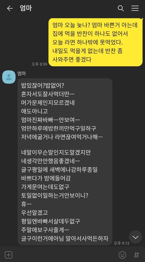 오늘 하루종일 라면 1개먹고 화난 마음에 어머니 퇴근하실때 톡을 보낸게 윗 사진입니다.