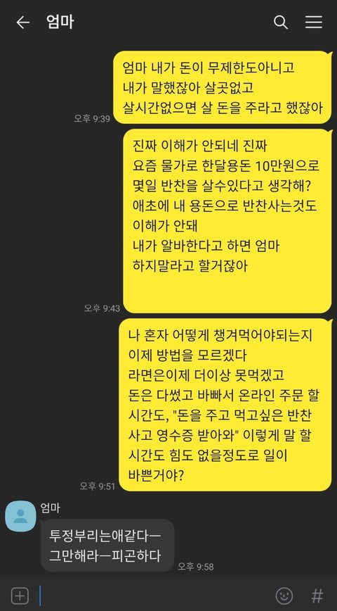 그래서 어머니한테 반찬좀 사달라고했는데 바빠서 장 볼 시간이 없다고 합니다.그럼 인터넷 주문을 하거나 나한테 살 돈을 달라고 했는데왜 자꾸 반찬투정을 하냐고 오히려 짜증을 내셨습니다. 엄마으 이런 대화법은 익히 알고 있어서 더 이상 답이 없다싶어 그냥 방문 쾅닫고 들어왔네요.
