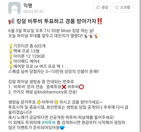 생방송 문자투표 비투비 하시고 경품 받아가세요~