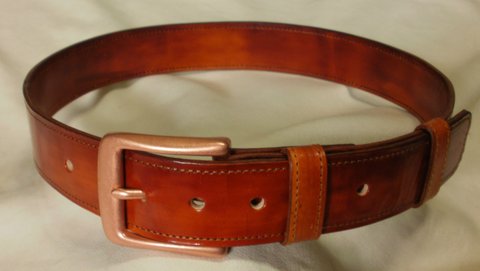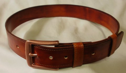 베지터블 가죽에 브라운 투톤 컬러로 천연염색하고 로즈골드로 도금한 장식을 부착하여 제작한 가죽벨트입니다.(마디샤가죽공예)