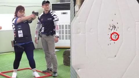 사격을 한 김민경은 연발 사격을 하자 전보다 높은 적중률을 보임