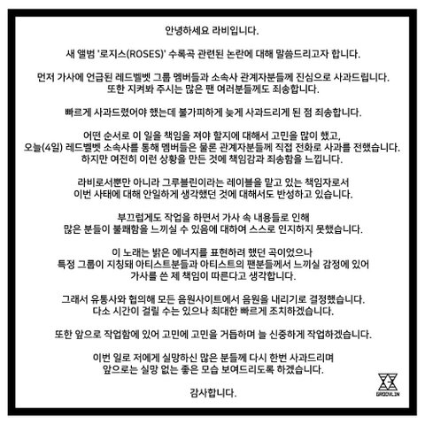 별빛인데도 기분 더러움. 그동안 자꾸 다른 연예인 이름이나 브랜드 이름 가져다가 노래 가사에 상업적으로 이용해서 불안불안 했었는데 성희롱 가사까지 쓸 줄 몰랐다. 정신 제대로 박힌 일부 팬들이 욕설 여혐가사 좀 그만 넣으라고 지적하고 직멘 보내면 안티라고 쳐맞은게 팬덤 분위기라서 겁나 무슨 성역같은 존재였음. 다른 멤버들이 했으면 쳐맞았을 사건들이 많았는데 래퍼라고 넘어간게 한두번이 아님. 아프리카BJ하고 방송하고, 여자 유튜버하고 방송하고 그런것도 다른멤버가 했으면 탈퇴총공 했을 사건인데. 그냥 다 넘어갔지.