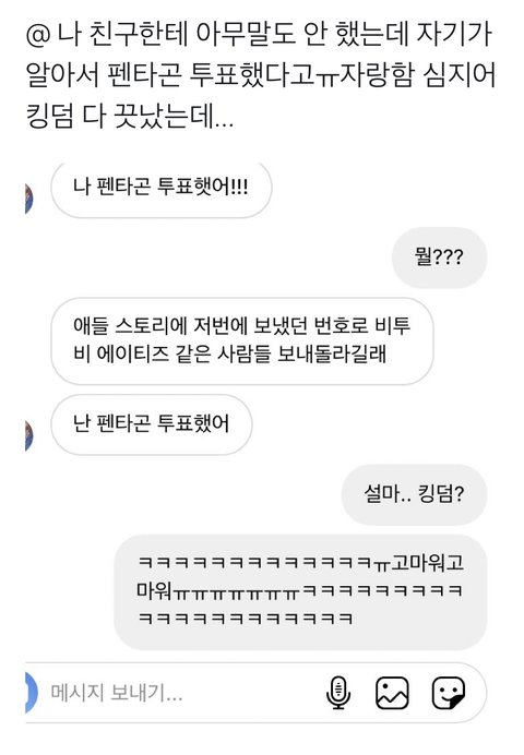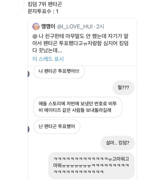 ㅋㅋㅋㅋㅋㅋㅋㅋㅋㅋㅋㅋㅋㅋㅋㅋㅋㅋㅋㅋㅋㅋㅋㅋㅋㅋㅋㅋㅋㅋㅋㅋㅋㅋㅋㅋㅋㅋㅋㅋㅋㅋㅋㅋㅋㅋㅋㅋ이로써 딱 1표 받고 킹덤 출연 없이 펜타곤 7위 됨;;;;; 심지어 저 친구분은 아직도 이 사실을 모르고 뿌듯해하는중ㅋㅋㅋㅋㅋㅋㅋㅋㅋㅋㅋㅋㅋㅋㅋㅋㅈㄴ웃김