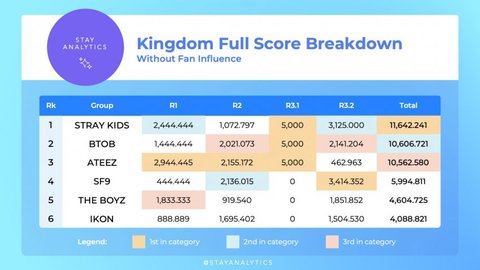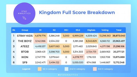보면 스키즈랑 에이티즈는 순위 변동 없음 걍 킹덤 취지에 맞게 무대 잘 했다는거.....