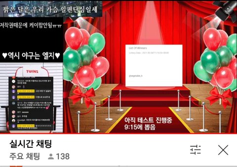 떨리냐면서 마음 편안하라고 불경과 찬송가에 이어 애국가 나온다... 레드카펫이랑 참여자들 다리아프다고 엘지트윈스 의자에 채팅창 앉혀줌..... 야구는 엘지 트윈스♡