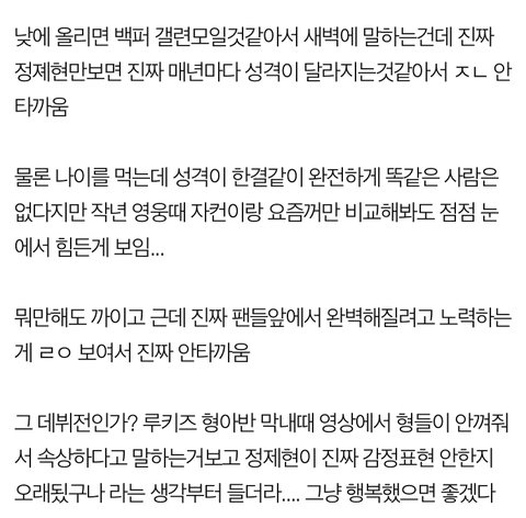 이런 말 하면 늙다리 개꼰대 같은데 원래 사회 나가서 생활하고 이런저런 일 겪고나면 성격 되게 많이 바뀜 심지어 데뷔전이랑 비교하기에는 나이도 나이이고 경험한 것들이나 상황이 우리가 생각해도 엄청 달라졌잖아 사람은 누구나 변해 변하지 않는 사람이 대단한거지 그게 나쁜쪽이든 좋은쪽이든 애가 바뀐다고 해서 너무 안타까운 사람으로만 보지는 않았으면 좋겠어ㅠ