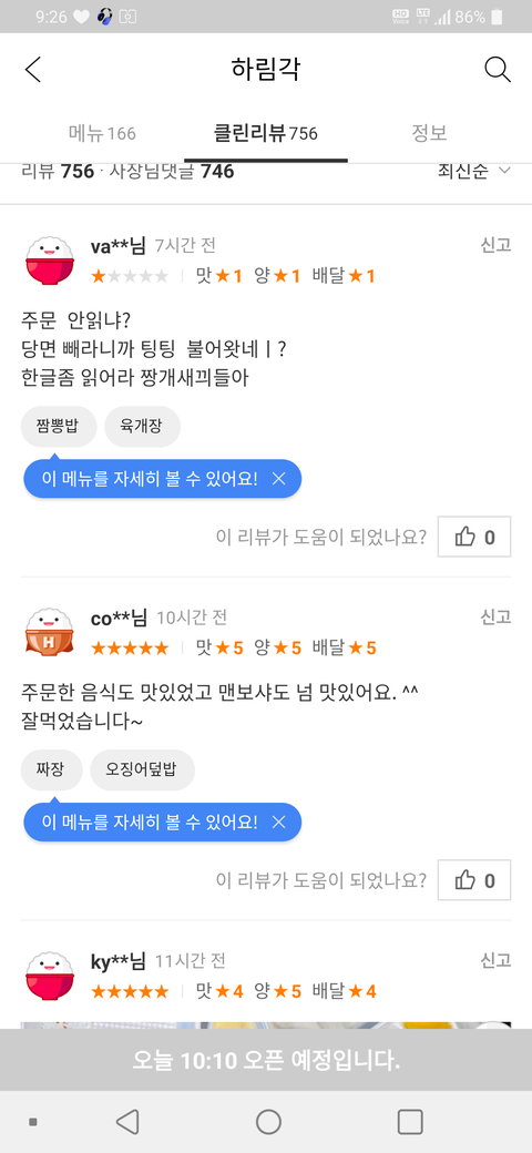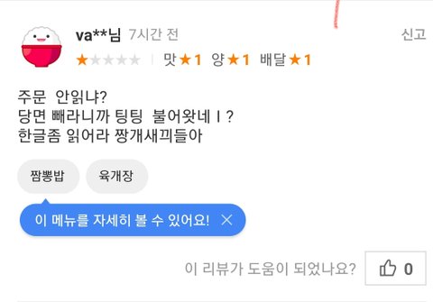 사건내용은 어제 토요일 점심피크타임에 육개장과 짬뽕밥 주문이들어왔고 육개장에 당면을 빼달라는 요청사항이 있었습니다. 그래서 육개장은 당면없이 배달되었으나 같이 주문한 짬뽕밥에 당면이 들어갔다는 이유로 저렇게 욕설과 비난 별점테러 갑질을 당했습니다. 정도가 지나쳐요 더는 이런일이 발생하지않았으면 좋겠네요 여러분의 생각도 궁금합니다.. 심지어 저희는 직원모두 한국분들이에요
