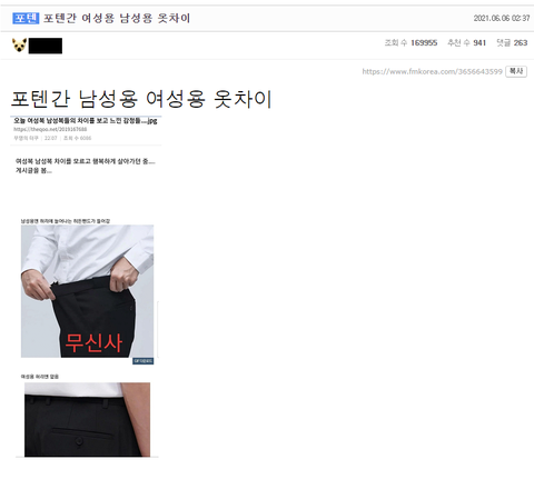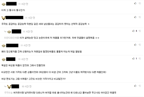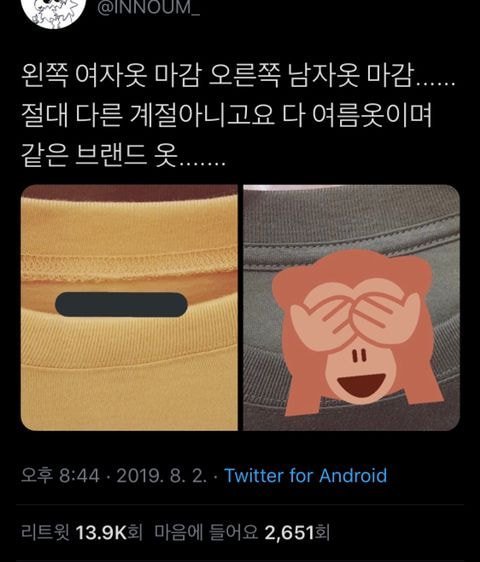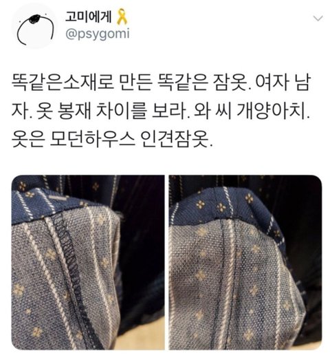 트위터에 올라온 사진들처럼 동일브랜드에서 동일라인으로 출시한 옷들이 남성용/여성용이라는 이유로 마감차이가 다르다는 사실이 확인됨.