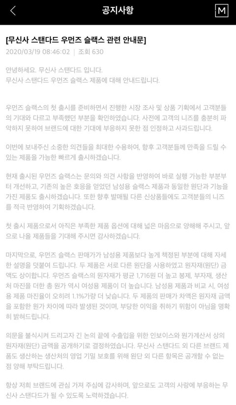 여성용 슬랙스를 따로 출시함. 근데 이과정에서 문제가 발생. 남성용 슬랙스에 들어간 기능들을 빼고 핏과 디자인을 살린 뒤 가격을 더 비싸게 올려서 출시함. 당연히 여성 소비자들은 항의했고 무신사가 사과까지 한 사건. 불과 1년전에 일어난 일이라 알고있는 판녀들도 있을거임