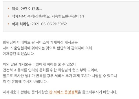 내 글을 정병 판 ㄴ들이 신고를 해서 게시물 삭제 당함