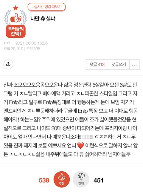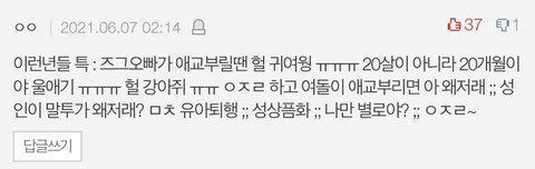나도 츄 싫어함. 호불호 갈릴 스타일인 건 맞지 않음? 저런 정신연령 어쩌고 저쩌고 하면서 비하하는 건 잘못된 거지만 츄의 그 지나친 텐션과 컨셉은 싫을 수 있는거잖아. 개인적으로 보고 있으면 너무 인위적이라서 거부감들더라. 물론 남자연예인이라고 다를 거 없음. 여자라서 츄가 싫은 게 아니고 과한 컨셉이 싫은거임.