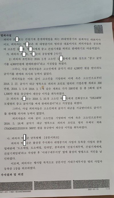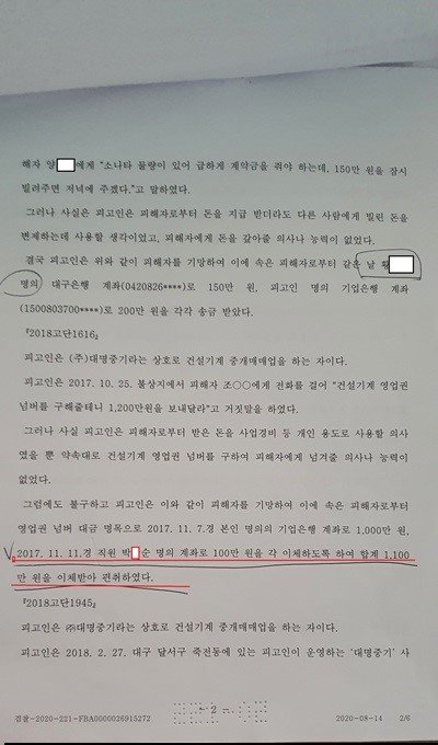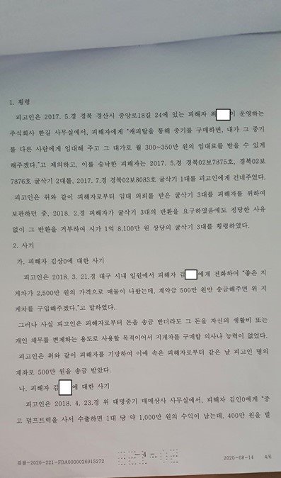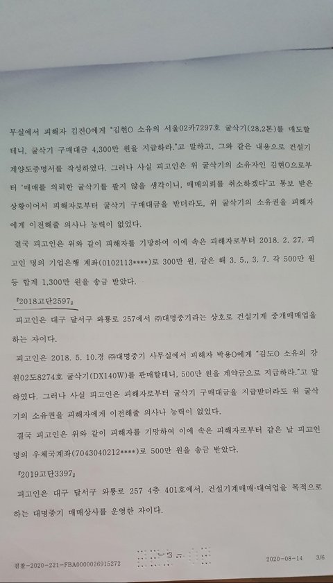 2018년5월경 대구에서 같은 직종의 사람에게 당시 싯가 52.000.000원 중고 중장비를 구입 하는 것으로 본인이 원하는 계약금 5.000.000원을 송금 하고 피고소인이 차일피일 미루기를 3개월이 넘어 확인을 하여보니 이미 또 다른 여러 사람들이 나와 똑같은 방법으로 사기를 당했음을 알게 되었습니다.