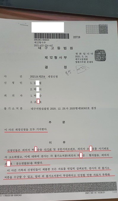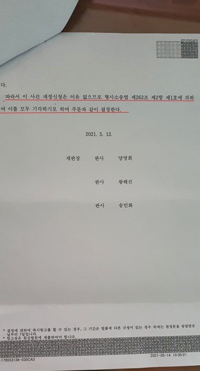 수개월이 지나 법원에서 날아온 결과 역시 재정신청 기각 검찰과 다를바 없는 결론이었습니다.