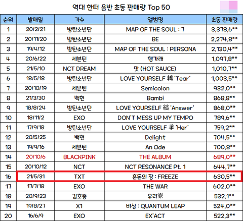 방탄소년단 - 세븐틴 - NCT - 엑소에 이어서 5번째로 초동이 높음 그룹이 됨ㅠㅠㅠ