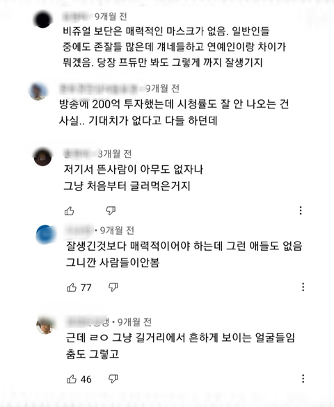 나는 아이랜드때부터 좋아했는데 커뮤를 안해서 이렇게 심각하게 까이는 줄도 몰랐네... 그래서 시청률이 낮았나 애들 전부 매력 있고 잘생겨서 나도 가볍게 보려다가 입덕한건데