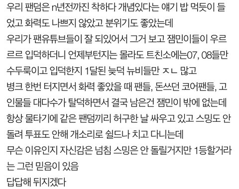 딱 아미같음 ㅋㅋㅋㅋㅋㅋㅋ 팬덤 나이대 어린거랑 병크 터지고 코어 우수수 빠진거랑