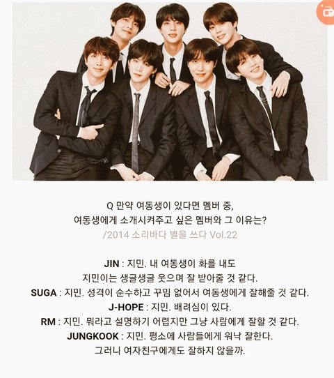 멤버들이 연생때부터 동고동락했으니 지민이에 대해 제일 잘 알겠지 그리고 멤버들이 거짓말 할 사람들도 절대 아니고..또 저글 읽으니까 일곱명 너무 잘만난것 같아ㅠㅠㅠㅠ