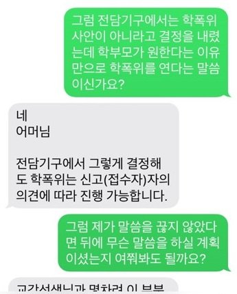 뒤늦게 따돌림을 알게 된 저는 학폭으로 신고하였지만, 학폭위 개최 전 열리는 학폭위 전담기구에서 이미 학폭 사안에 해당하지 않는다고 결정내렸다며 학폭위 미개최를 종용하는 문자와 전화가 학생부장교사와 교감으로부터 번갈아가며 왔습니다. 증거자료입니다. 언제부터 따돌림이 학폭 사안이 아니었던가요?