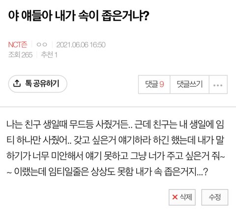 애들이 인스타 스토리에 자기가 선물해준거 빨리 자랑하라 그래서 내가 다 올려줬거든 그랬더니 스토리가 무슨 바느질 한거처럼 어제 엄청 많이 올렸는데 나랑 베프 그리고 저 임티 사준 친구가 학원을 같이 다녔는데 내가 이번달부터 혼자 하겠다고 하고 안다니고 있거든 근데 내 베프가 임티 준 친구한테 너는 얘가 무드등 사줬는데 임티 딸랑 하나 주는게 말이 되냐고 양심도 없냐고 얘가 너한테 이렇게 잘해줬는데 너도 주는게 있어야지 내년에 얘가 너 생일 챙겨줄거 같냐고 막 뭐라 한거야.. 난 아무것도 모르고 있다가 오늘 저녁에 미안하다고 내가 다른걸로 다시 사주겠다는걸 내가 괜찮다고 극구사양했는데 뭔가 나만 느낀게 아니라 내 친구도 느끼고 있었구나.... 이런 생각이 드네 서운한 건 사실인데 뭐 어쩌겠나 그냥 잊고 살아야겠지? 사실 진짜 서운하긴 했어