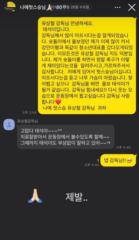 그리고 이건 유상철 감독이 생전에 이태석과 주고 받은 메세지ㅠ
