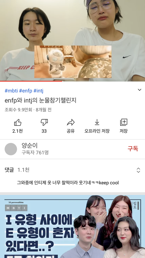 위 사진은 슬픈영상들 보면서 Intj 랑 Enfp가 리액션 하는 영상임