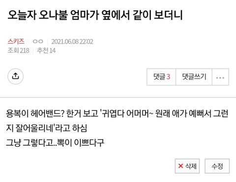그리고 승민이도 꽤 좋아하시는데 이유는 노래를 잘불러서...그리고 이건 좀 tmi인데 아드님이랑 이름, 나이가 같아서 더 친근감이 있나봐 ㅋㅋㅋㅋ우리 친오빠도 22살에 이름이 승민이거든..