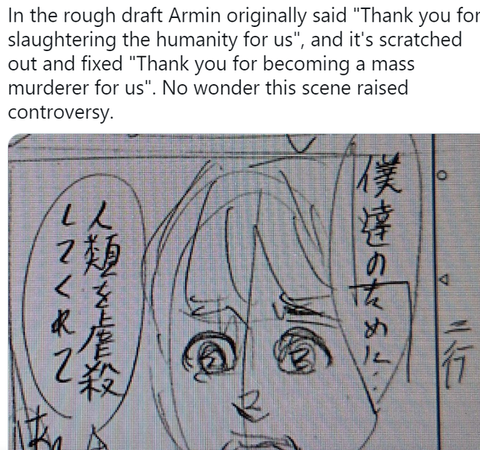 정발본에는 '학살자가 되어줘서 고마워’로 나왔는데 콘티에 나온 원래 대사는 '인류를 학살해줘서 고마워’였뎈ㅋㅋㅋ.....진짜 ㅈㅗㅈ지메 빡대갈 같음.. 심지어 정발본 수정 안됨...