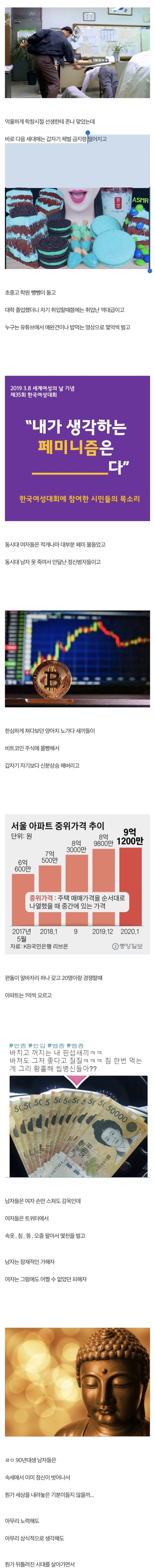 웃긴 거 뭔지 암? 저기 명시되어 있는 목록 중에 여자가 남자에게 직접적으로 가한 피해는 하나도 없음. 심지어 대부분은 모든 20대가 겪는 거지 90년대 남자들만 겪는 일도 아님. 자기들 힘든 거 끌어오려면 저런 것 밖에 없는 거임 여자들아 정신 차리자. 남자들 불쌍한 거 결코 아니다.