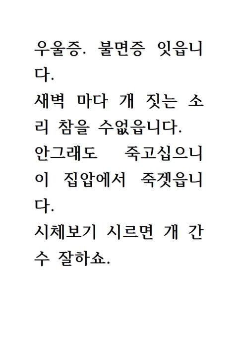 안녕하세요이웃집 대형견이 새벽 내내 짖어요아시겠지만 대형견 울림통이 커서 더 시끄러운데정말 새벽 내내~~~ 짖어서 고통스럽습니다ㅠㅠ현재 할 수 있는건 생활민원을 넣는 것 뿐이더라고요민원 열심히 매일밤마다 넣고 있지만 해결이 안 되고 있어서그 집 문에 사진과 같이 두팔체로 글써서 붙이려고 하는데법적 문제가 있지는 않을지 조언을 구합니다..!읽어주셔서 감사합니다!