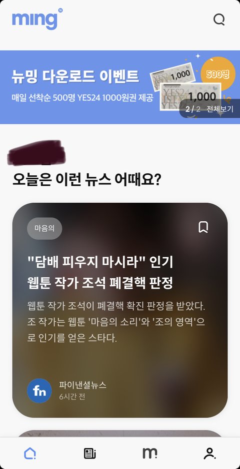 뉴밍이라는 어플 설치하면 매일 선착순(500명)으로 예스24 상품권 1000원 주고 있어요