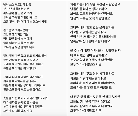 공론화 시키기에는 조금 사건 스케일이 약하다는거 잘 알지만, 지금 이게 정상적인 사회인지 의문이 든다... 정말 이런 화합을 바라는 노래에서까지 서로 헐뜯고 댓글창 난리나는거 보면 가슴 아픔... 우리 사회가 이 정도로 병들어 있다는 것을 반증하는 거니까... 개인적으로 이 사건 꼭 공론화 되었으면 하는데 왜 아직도 공론화 안되고 있는지 참으로 신기함...