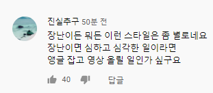 "장난이든 뭐든 이런 스타일은 좀 별로네요 장난이면 심하고 심각한 일이라면 앵글 잡고 영상 올릴 일인가 싶구요"