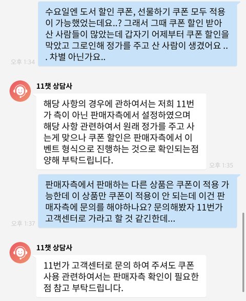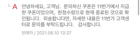 판매자측에선 쿠폰 막아놓은 거 뭔 한정이라고 자세한건 11번가 고객센터로 문의를 주라는거임 그래서 고객센터로 문의를 했더니 쿠폰 설정은 판매자측에서 하는거라고 인터파크 도서에 문의를 하래 아니 진짜 어쩌라고 나 지금 천서진 핑퐁마냥 어이가 없어