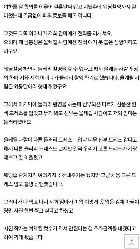 들러리 촬영을 시모랑 시누자리가 찍었다는것도 웃기지만 애초에 웨딩촬영을 시댁식구들이 왜감?