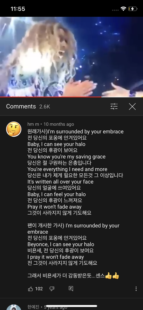 비욘세가 halo 부르다가 팬한데 마이크 넘겼는데 팬이 비욘세 당신의 후광이 보여요 그것이 사라지지 않길 기도합니다 이렇게 개사해서 부른거임 영상으로 봐야함 이건