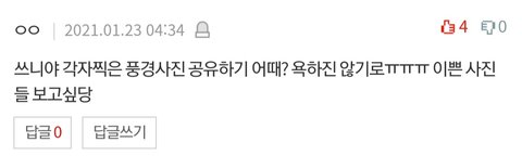다들 예쁜 사진 공유 많이해줘!!! 꼭 풍경이나 감성사진이 아니여도됑 그냥 추억이 담긴 사진이나 올리고싶은 사진 막 올려 ㅋㅋㅋ 중요한 포인트는 '자신이 직접찍은 사진'이야!